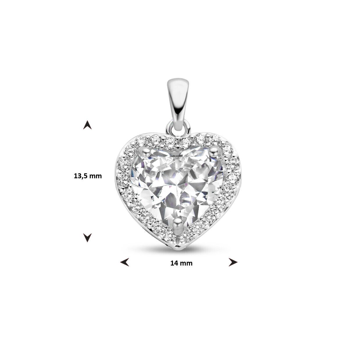 Zilveren gerhodineerde hanger met schitterende zirconia's die een grote zirconia omhelzen, gezet in een prachtig puur hart.