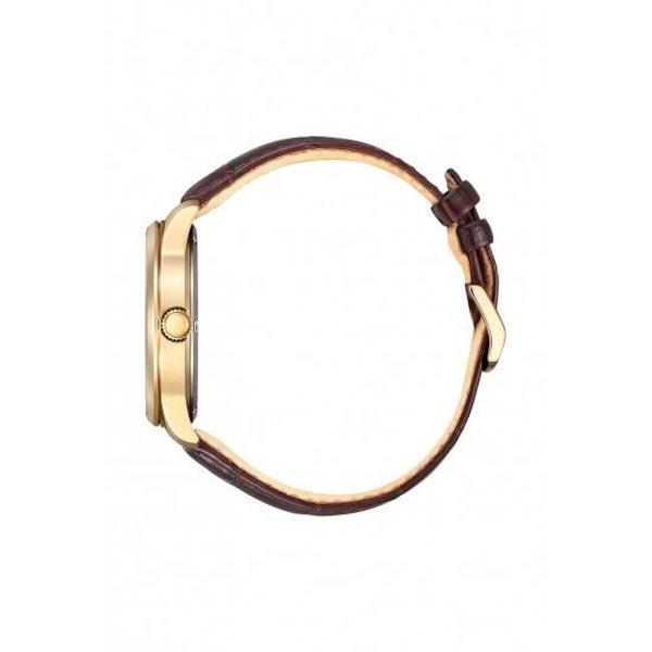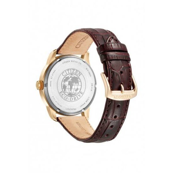Dit Citizen Eco drive horloge van geel kleurig edelstaal uit de leather collectie heeft een witte wijzerplaat met een bruin lederen kroko band met stiksels. De kastdiameter is 41,5mm.