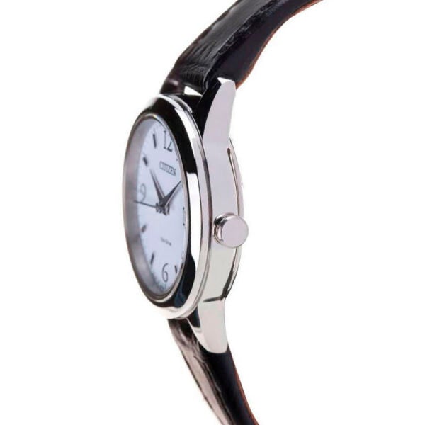 Dit Citizen Eco drive horloge van edelstaal uit de leather collectie heeft een witte wijzerplaat met een zwart lederen kroko band met stiksels. De kastdiameter is 28mm.