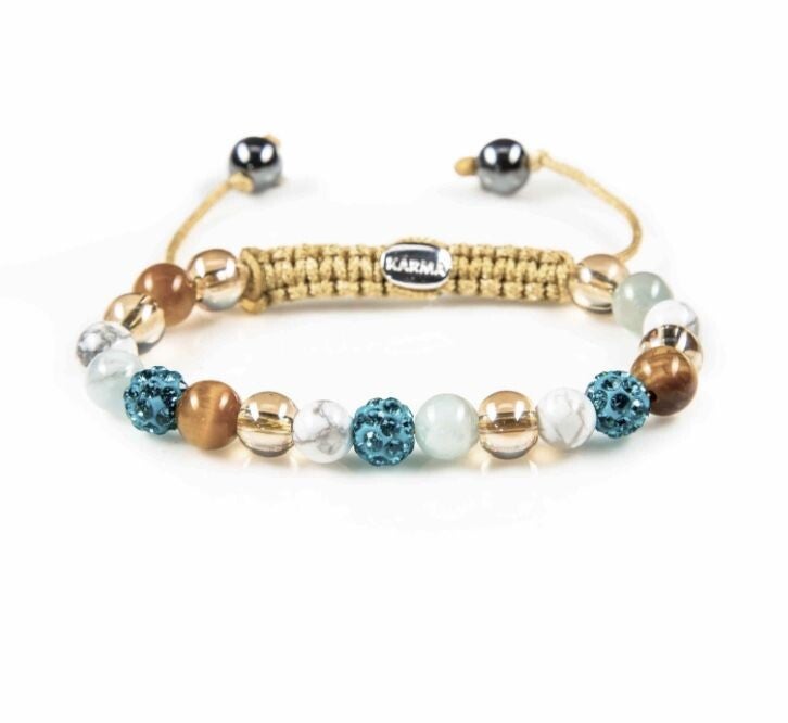 Deze echte edelstenen armband met blauw crystal van Karma is op verschillende lengtes draagbaar.