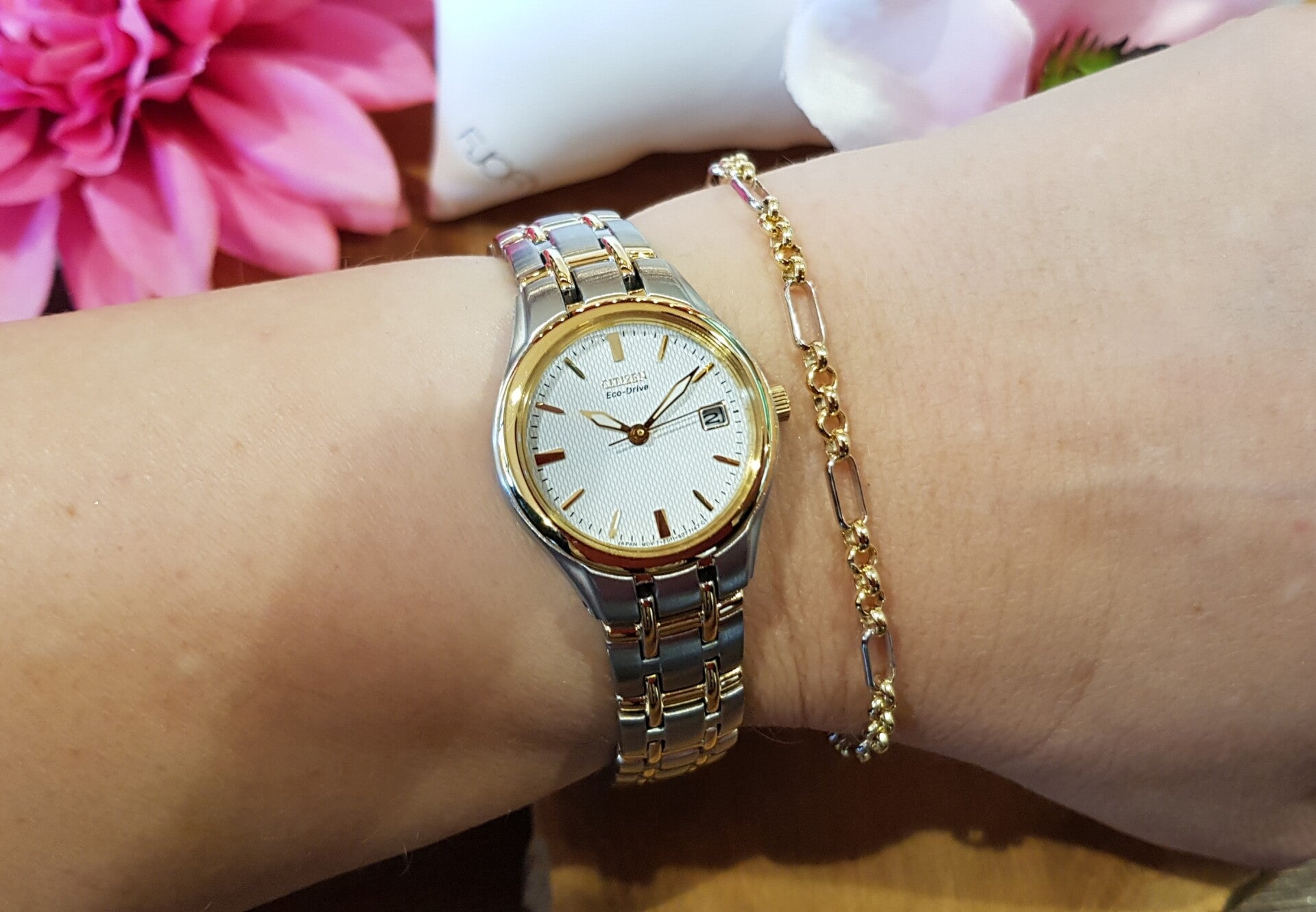 Deze Fjory armband is van 14krt. geelgoud met de lange schakels in witgoud met een kern van zilver 925.