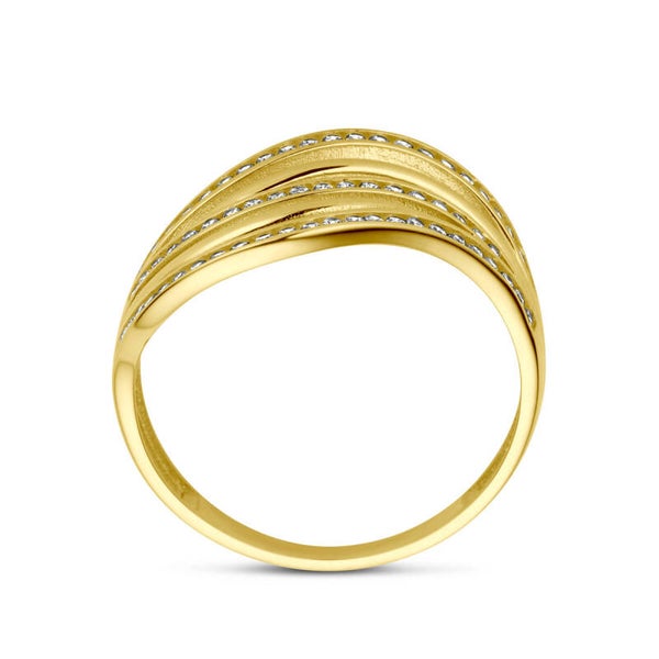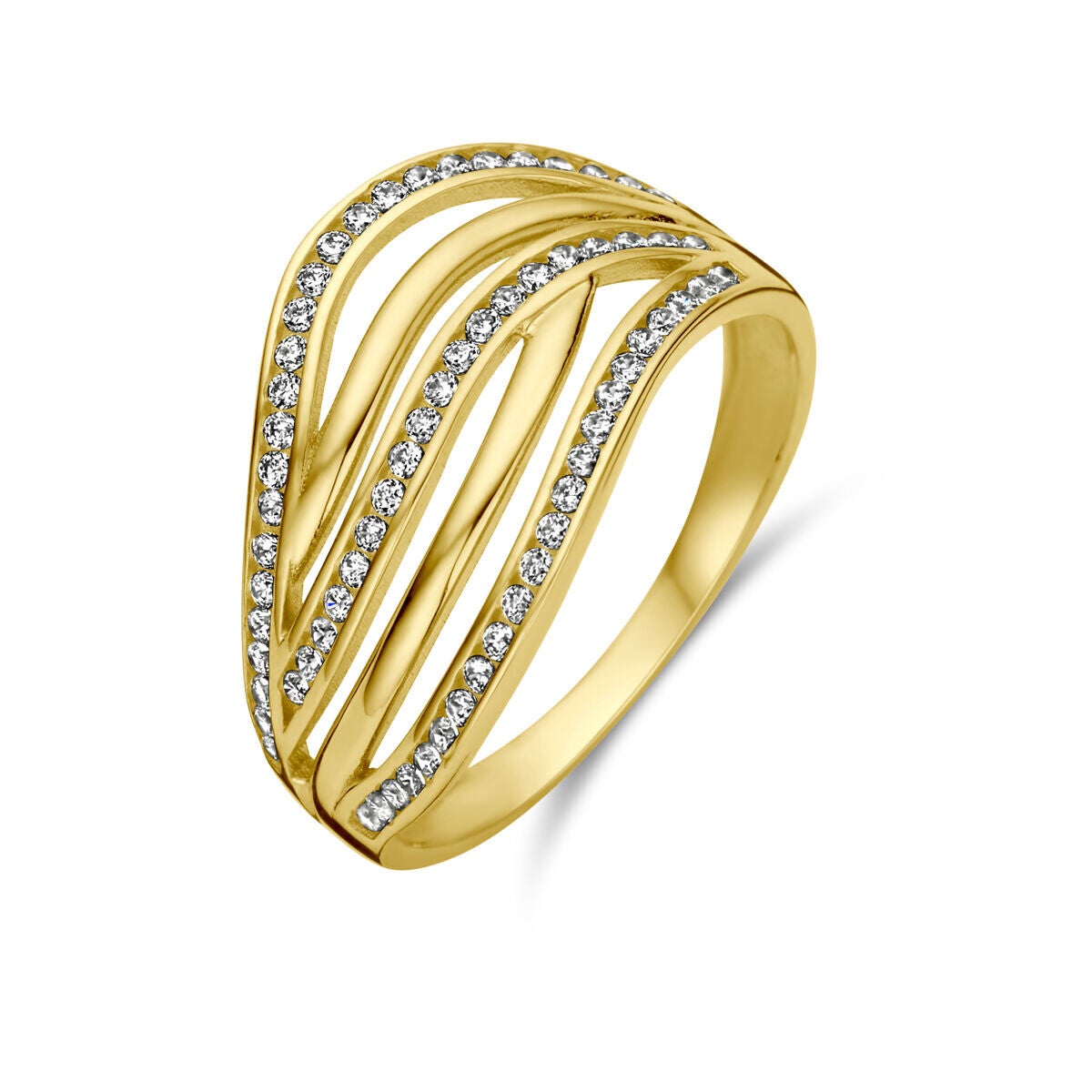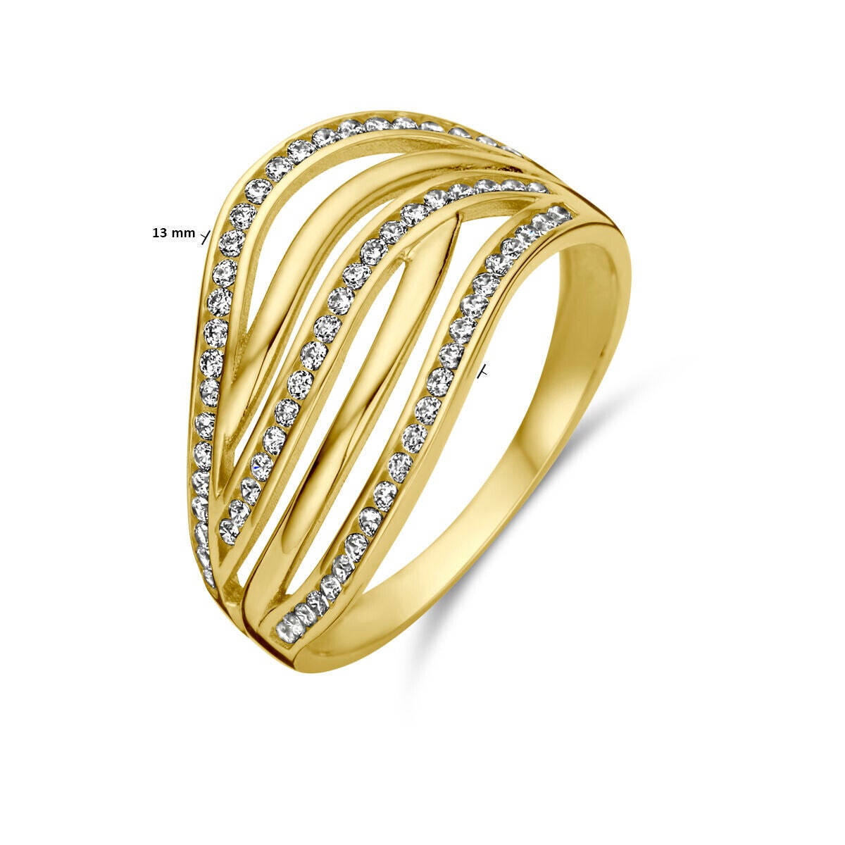 Ring van 14 krt. geelgoud uitgevoerd met zirkonia. De ring heeft een breedte van 13mm.