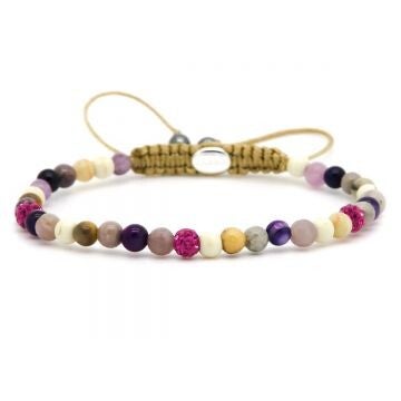 Deze Karma armband is op elastiek geregen met edelstenen en fuchsia crystal.