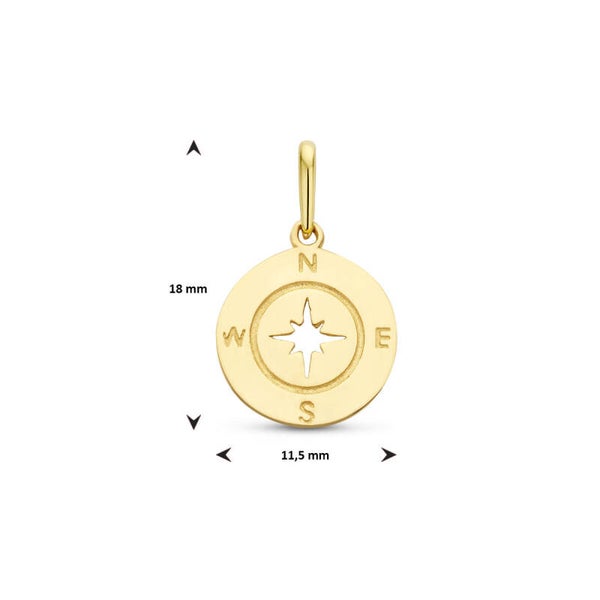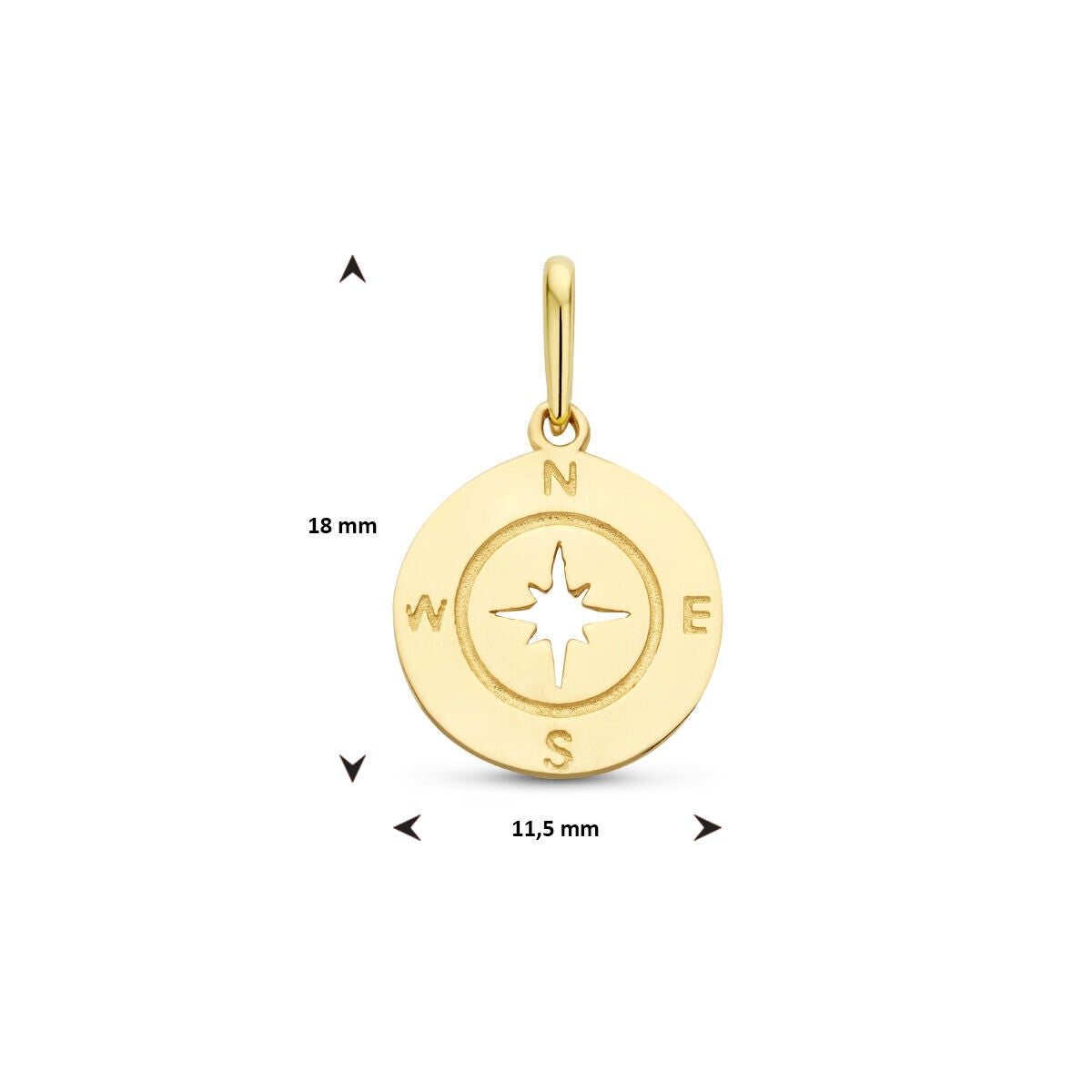 14k Geelgouden ronde hanger met een kompas voorstelling. De hanger heeft een totale hoogte van 18mm.