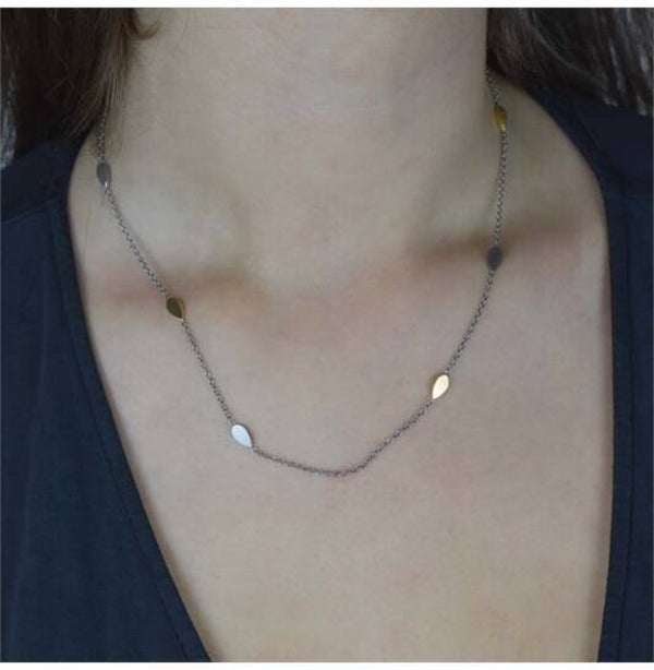 Deze titanium ketting is deels vd verguld. Ankerketting met bladvorm.