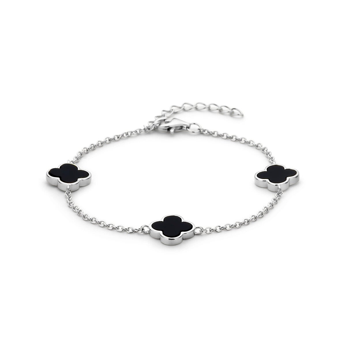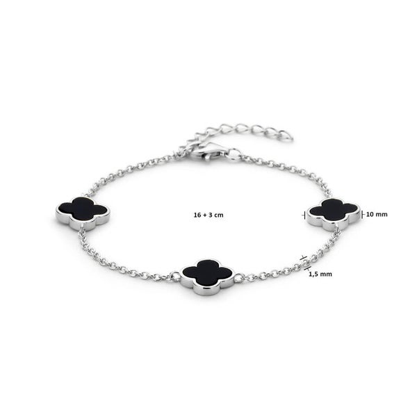 Gerhodineerd 925 zilveren armband uitgevoerd met klavertjes en onyx. De armband heeft een draaglengte van 16cm met 3cm extensie en schakelbreedte van 1.5mm. Uitgevoerd met karabijnsluiting.