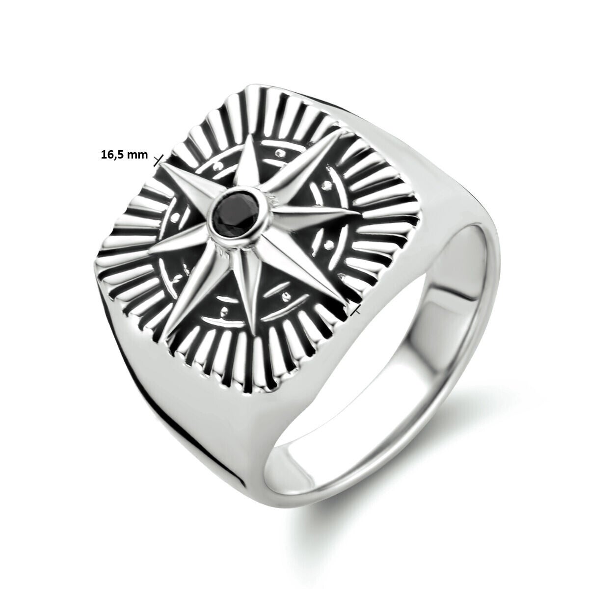Gerhodineerd 925 zilveren zegelring uitgevoerd met een ster en een schitterende zwart zirkonia. De ring heeft een breedte van 16.5mm.