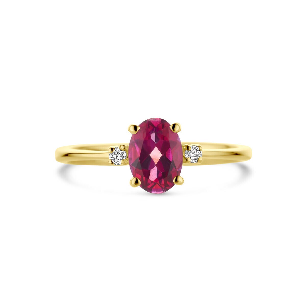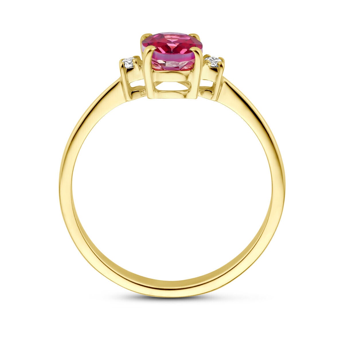 14k Geelgouden ring uitgevoerd met roze topaas en diamant.