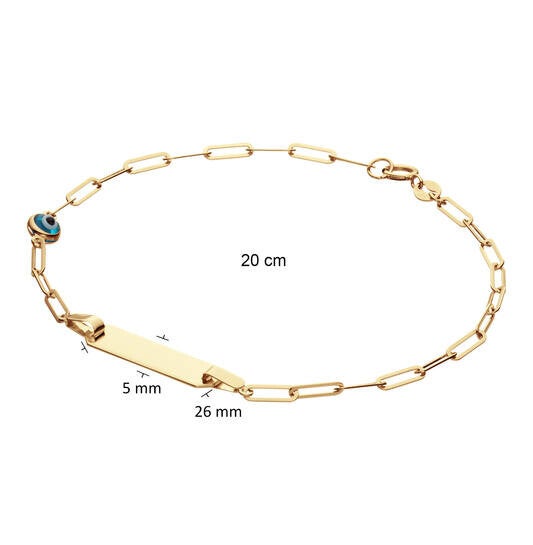 Deze 14 karaat geelgouden armband met paperclipschakels met daartussen het"boze oog" (een talisman tegen slechte energie en jaloezie) heeft een graveerplaat waar de naam (gratis gravure) in gegraveerd kan worden.