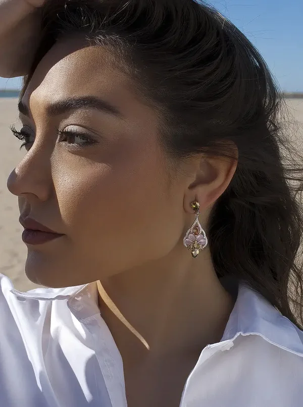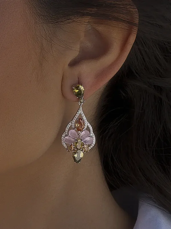 Zilveren gerhodineerde oorhangers met barok ontwerp en romantisch getinte kleurstenen in zacht roze, perzik en olijf groen. Voor het dragen van een stukje natuur en charme.