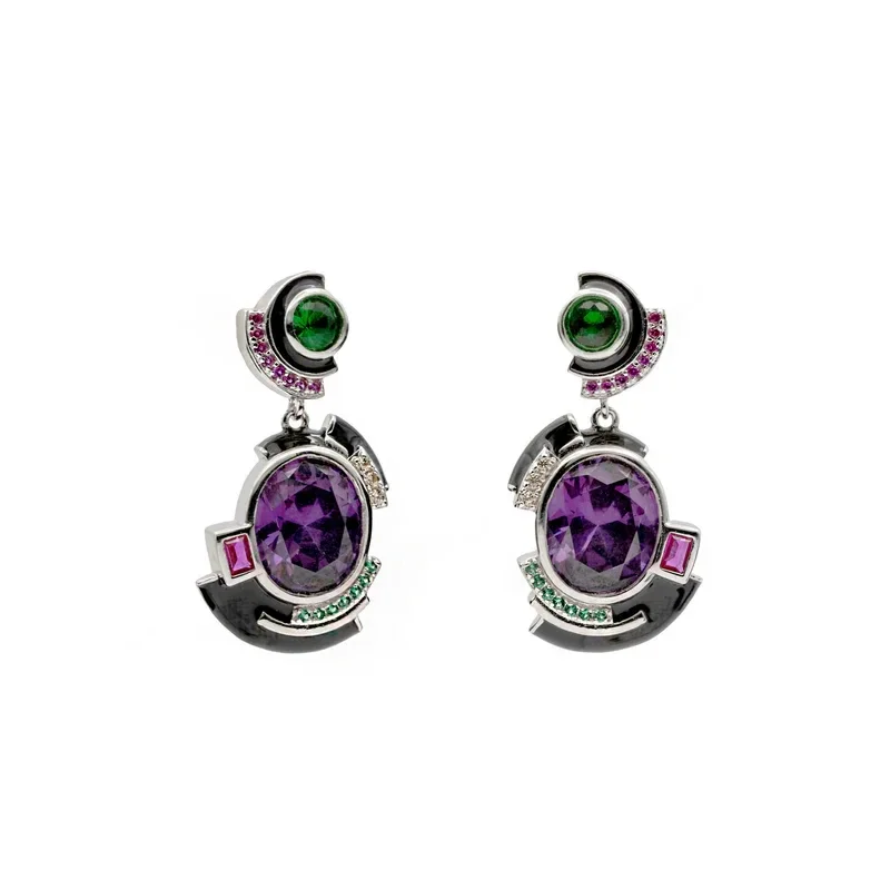 Zilveren oorbellen bestaande uit verschillende stukken met verschillende vormen en kleuren die een soort chaos creëren tussen de stukken.