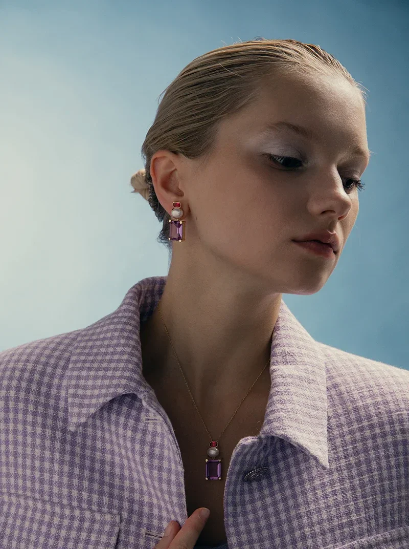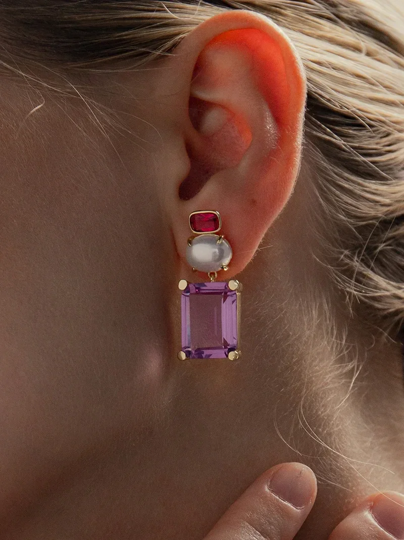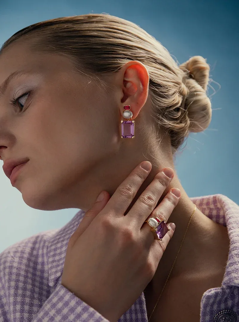en de derde steen is baquette geslepen in een heeft een paarse tint.