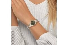 Dameshorloge van Olympic met stalen band en kast met groen wijzerplaat met datum op de 3. Band met goudkleurige accenten.