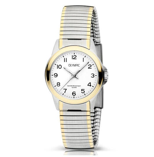 Dameshorloge van Olympic met stalen rekband en kast met witte wijzerplaat en zwarte cijfers. Met datumaanduiding.