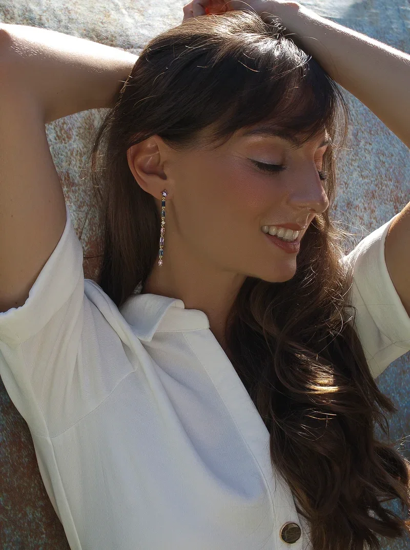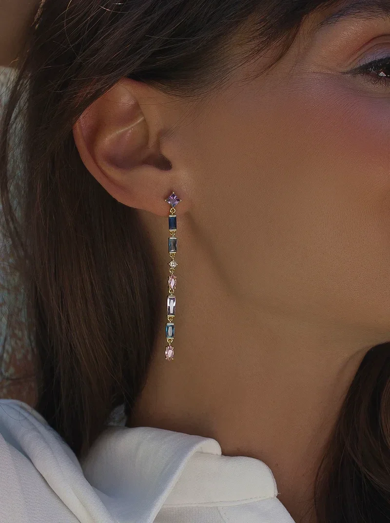 Lange zilver vergulde oorbellen mat kleurrijke stenen.