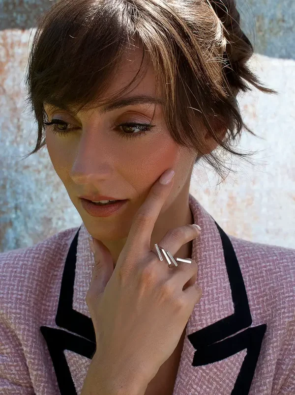 Zilveren ring met een trapsgewijs design met zirconia's en glad zilver
