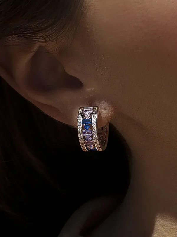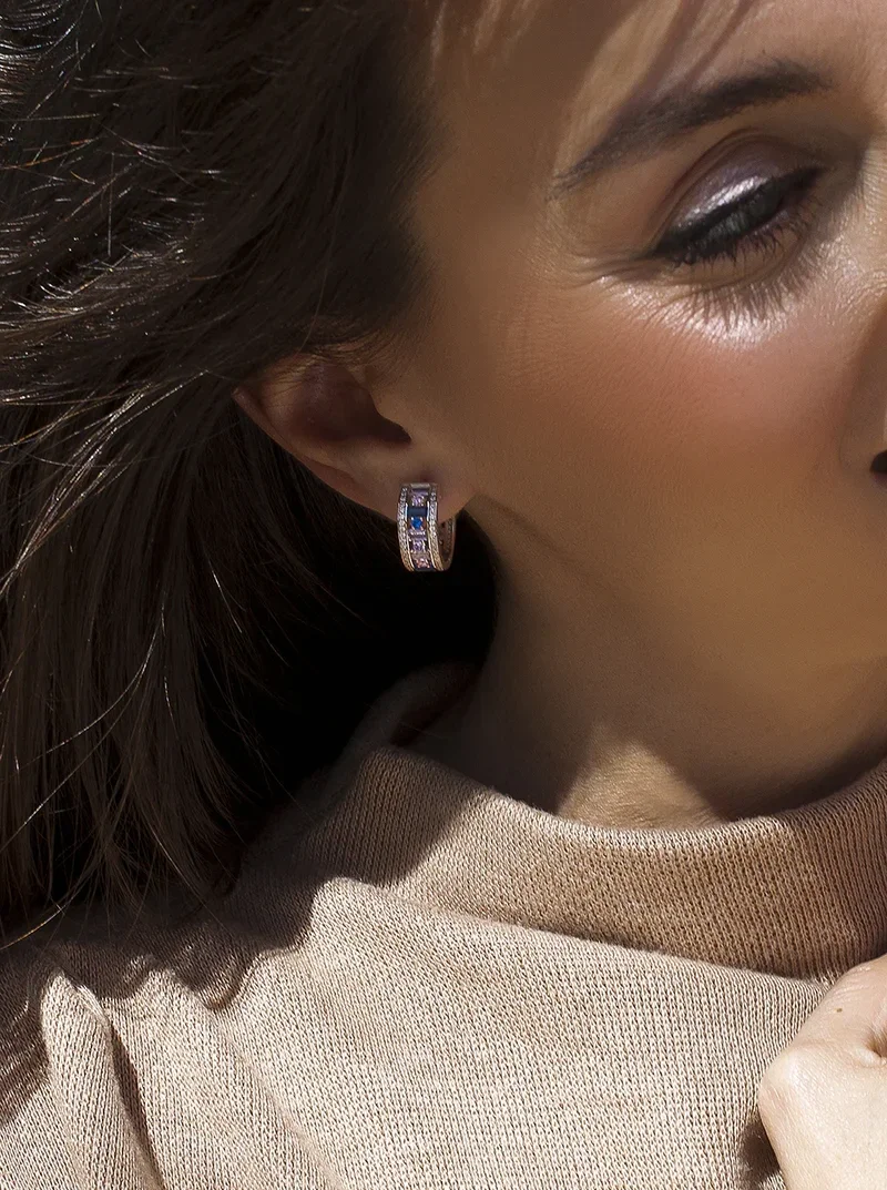 Vrolijke creolen met veelkleurige stenen.Leuk om je outfits aan te vullen en een vleugje kleur te geveZilveren creolen met stenen in de kleuren blauw en rozel witte zirconia's aan de zijkanten.