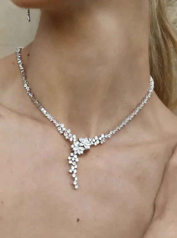 Zilveren elegante collier met een glimmende trij zirkonia's die eindigen in een waterval van bloemen en kleinere zirkonia's.