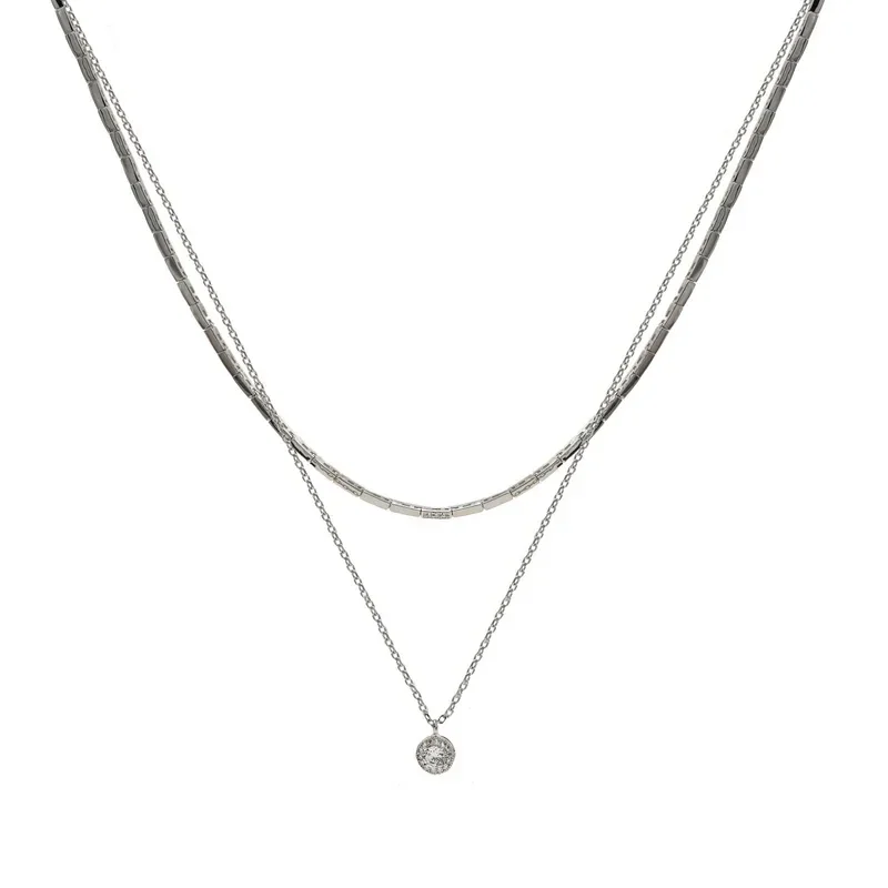 Schakelketiing met strakke glimmende schakels met in 3 schakels zirkonia;s gezet en daarbij een dunner collier(ankerschakel) met een ronde hanger eraan met zirkonia's