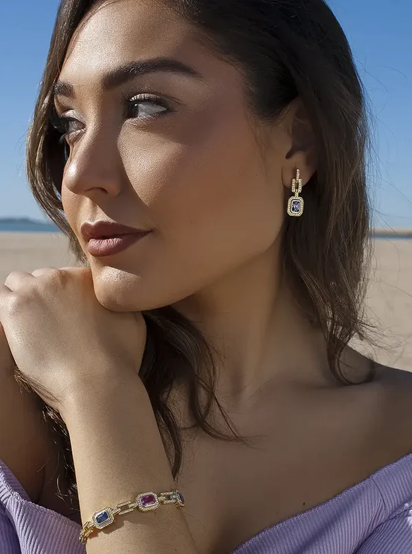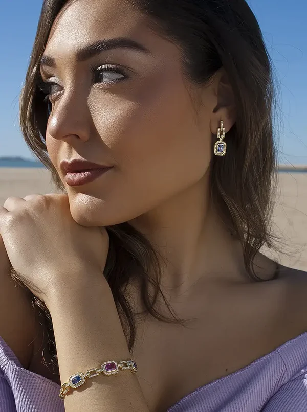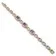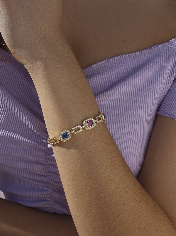 Zilver vergulde armband met zirconia's en 3 rechthoekige stenen in een roze en blauwe tint.