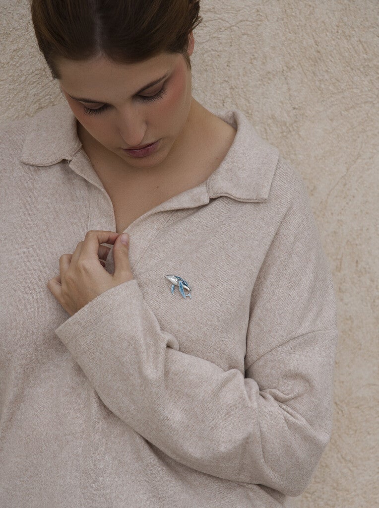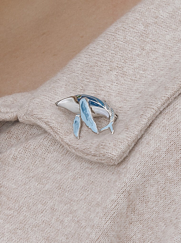 Deze charmerende walvis broche in de vorm van een bultrug is de perfecte accessoire voor liefhebbers van kleur of de zee. Hij sprankelt dankzij de rij zirconia's op de rug en de geëmailleerde parelmoer op de buik.