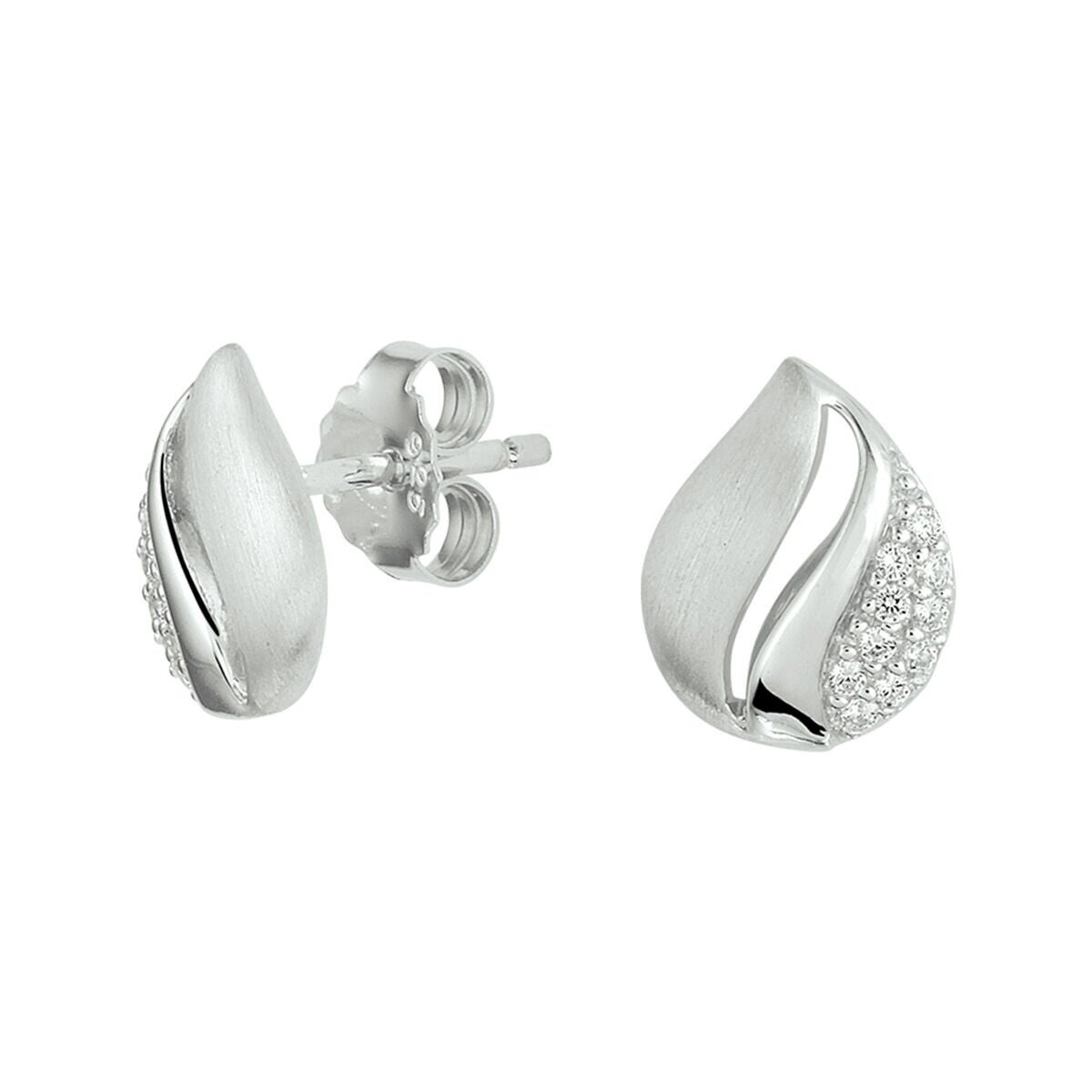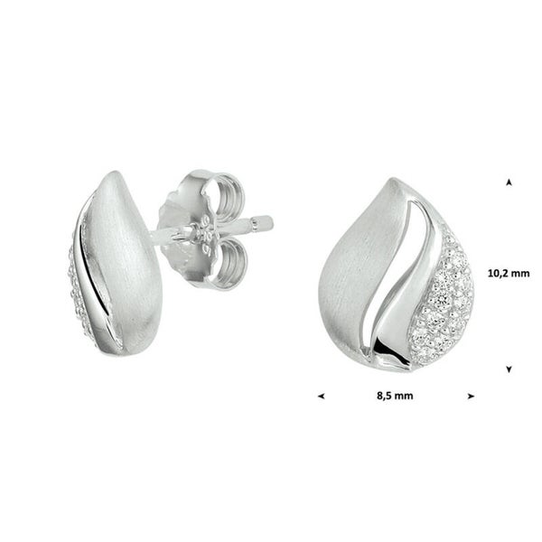 Zilver gerhodineerde oorknoppen in de vorm van een elegante druppel en gedeeltelijk matte afwerking. Samen met de zirconia's maakt dit een stralende toevoeging aan je outfit!