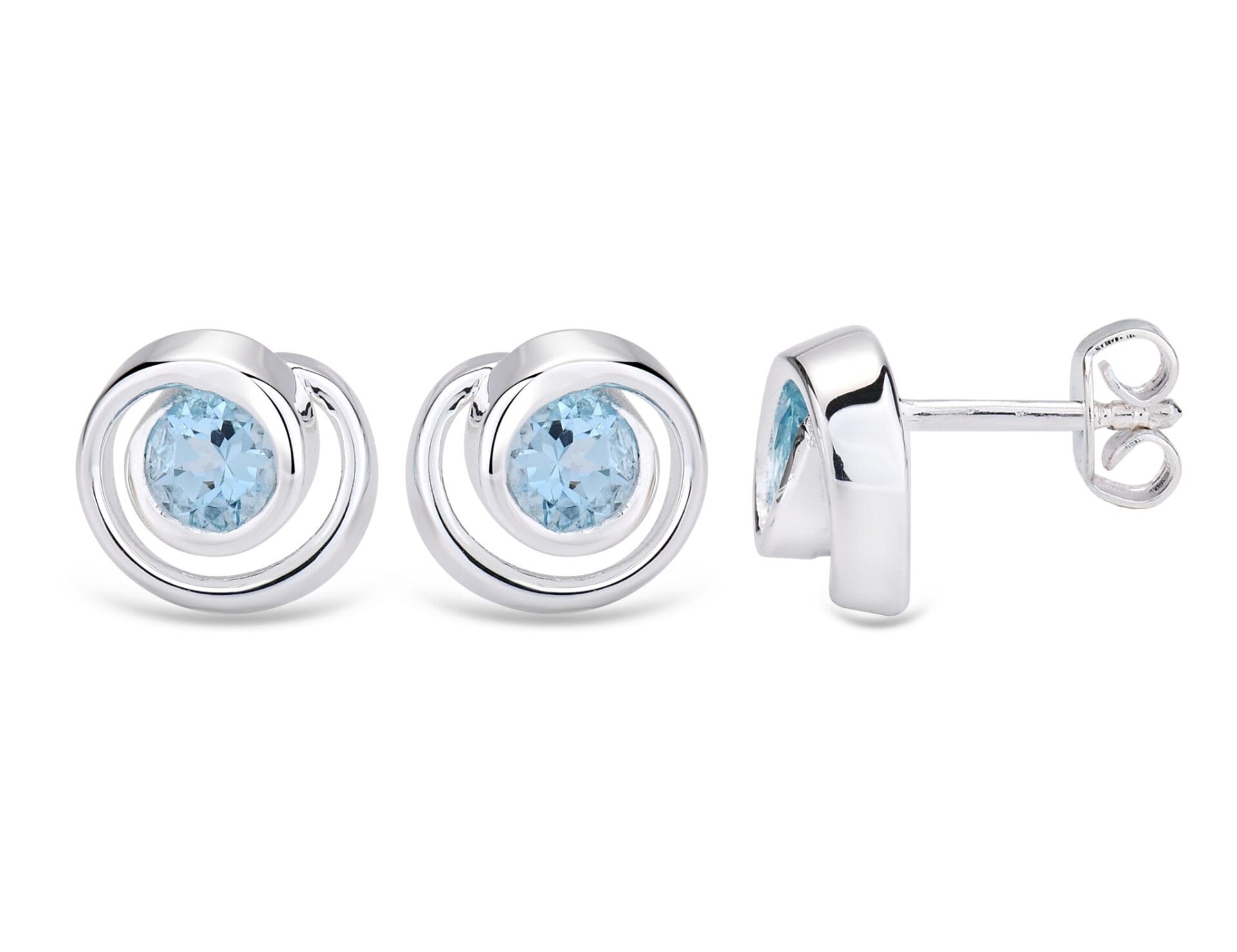Zilveren gerhodineerde oorknoppen met ijs blauwe topaas gezet in een elegante spiraal lus.