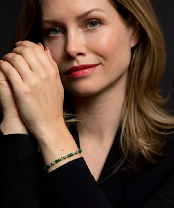 Stalen armband met groene edelstenen, die bestaan uit groene aventurisme en agaat, en goud vergulde kralen. De groene kleur zorgt voor een kalme en rustige uitstraling.