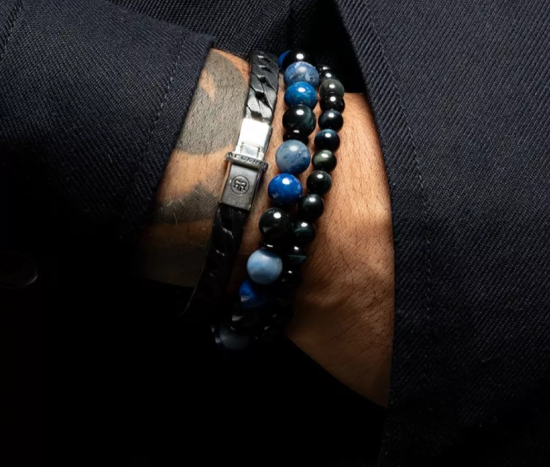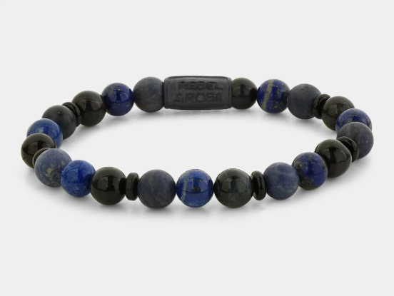 Stalen armband met echte edelstenen en een zwart gekleurd slot. De edelstenen bestaan uit agaat, blauw tijgeroog, lapis lazuli en sodaliet. Een echte eyecatcher dankzij de kleurspeling tussen blauw en zwart.