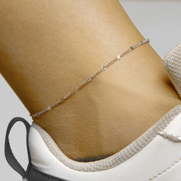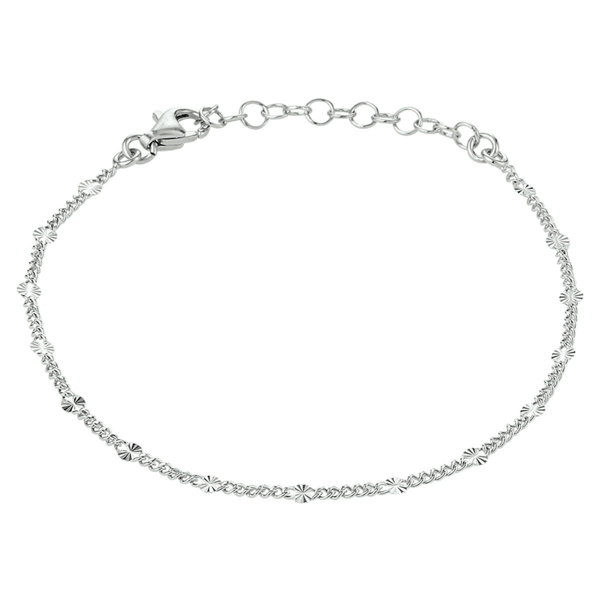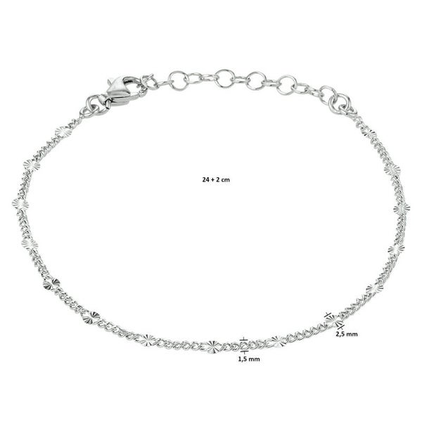 Zilveren gerhodineerde enkelband met gourmet schakels en platte gewaaierde cirkels die zorgen voor een leuke schittering. Met handige verlengketting kan deze enkelband op verschillende lengtes gedragen worden.