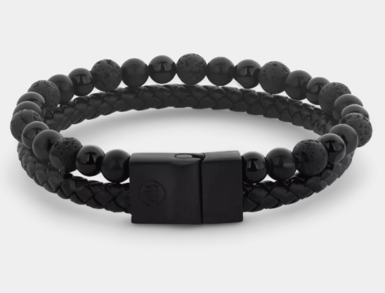 Stalen armband met écht edelstenen, zwart gekruisd leer en zwart gekleurd slot. De edelstenen bestaan uit agaat, onyx en lavasteen.