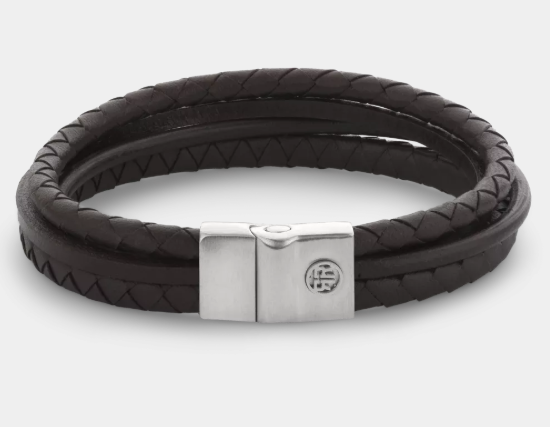 Stalen armband met donker bruin gekleurd leer in verschillende texturen en een zilver gekleurd slot. Perfect te combineren met de kralen armbanden.