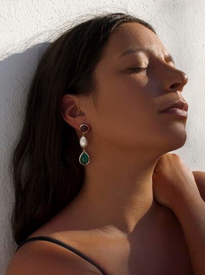 Zilveren rosé vergulde oorhangers met twee luxe gekleurde kleurstenen in wijn rood en moss groen. Afgemaakt met een prachtige imitatie parel.