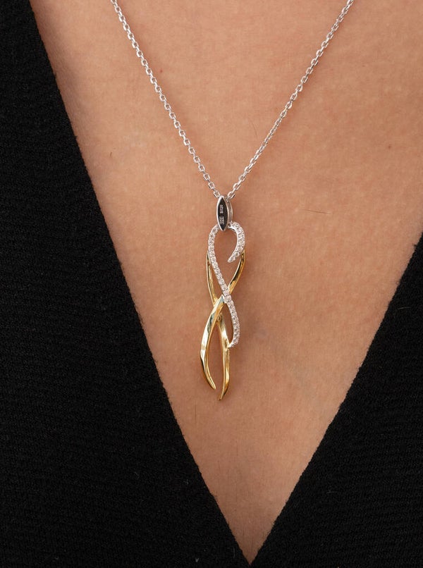 Zilveren bicolor ketting met golvende hanger en zirconia's