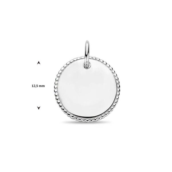 Zilveren gerhodineerde graveerhanger rond met versierde ribbel rand.