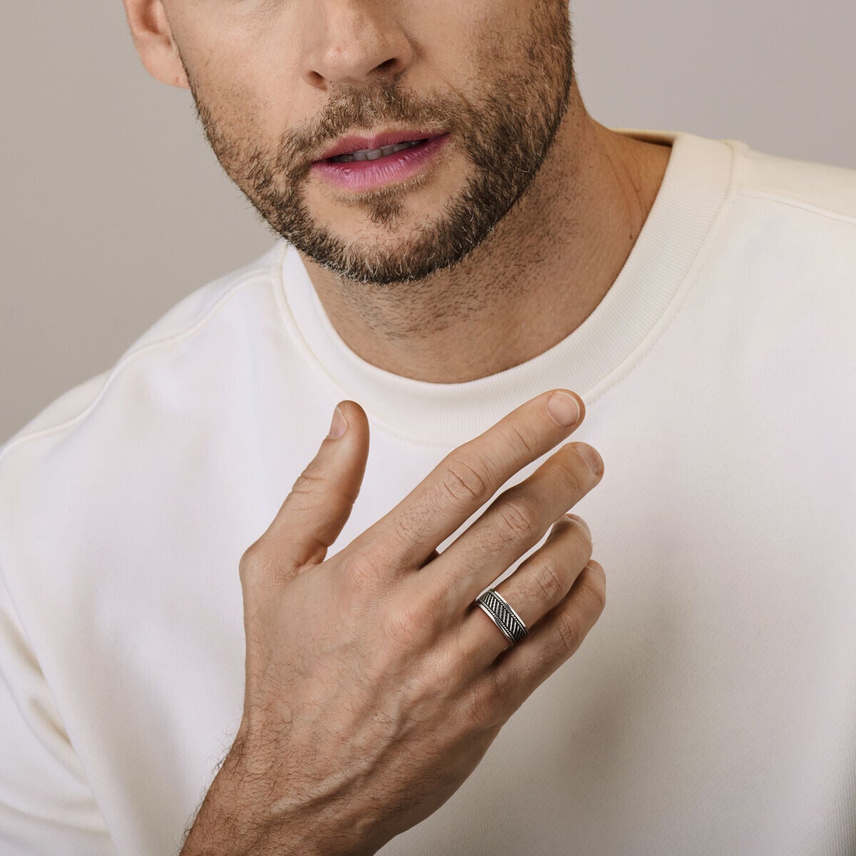 Zilveren geoxideerde ring met groeven in een cross patroon.