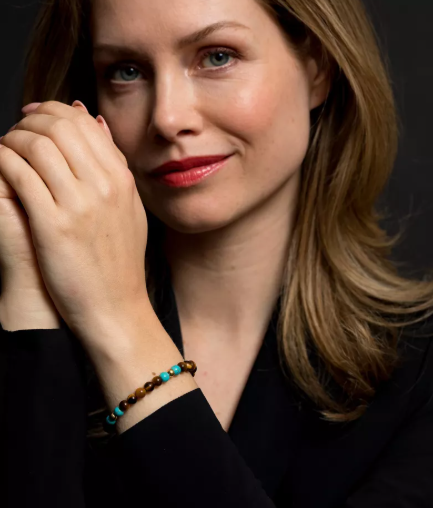 Stalen armband met echte edelstenen en goud vergulde kralen. De edelstenen bestaan uit geel-bruine tijgerogen en turquoise. Met de warme gloed heeft deze armband een zachte en authentieke uitstraling.