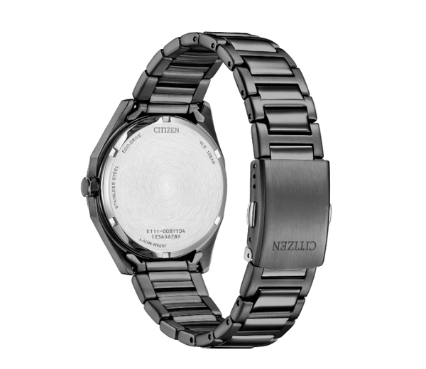 Dit Citizen Eco-drive horloge van gunmetal roestvrijstaal uit de sports collecite heeft een donker-grijze wijzerplaat met zilver gekleurde strepen index en een schakelband wat zorgt voor een stoer en tijdloos ontwerp.