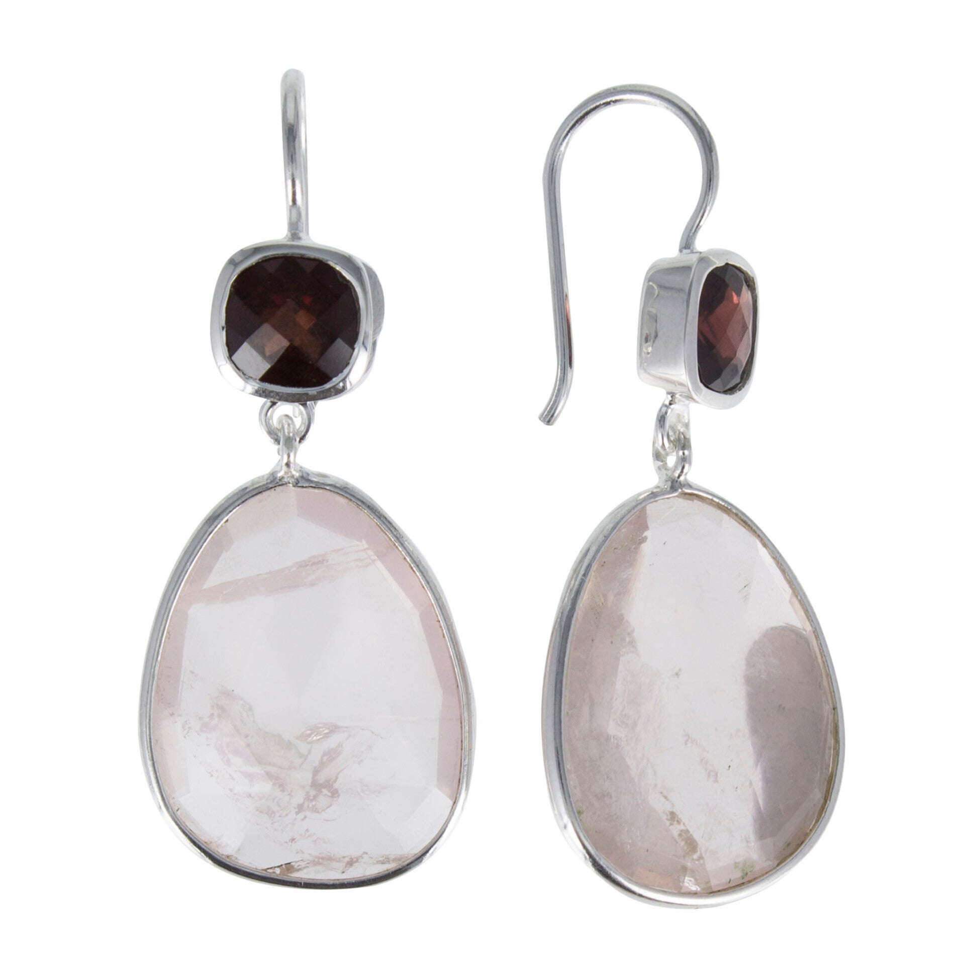 Zilveren oorhangers met facet geslepen rozenquartz en rodoniet voor de prachtige speling in roze en rood tinten met elegante druppel vorm.