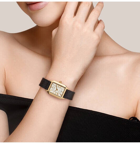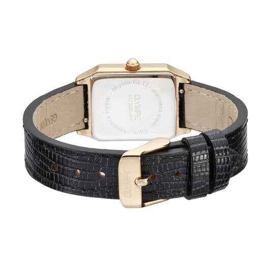 Dit Olympic horloge van doublé staal heeft een vierkante witte wijzerplaat met romeinse index en een zwart schubben getextuurde lederenband wat zorgt voor een elegant ontwerp met luxieuze uitstraling.