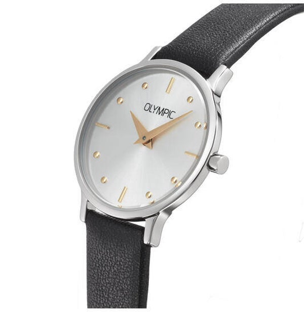 Dit Olympic horloge van staal heeft een zilver gekleurde wijzerplaat met goud gekleurde wijzers en een combinatie stippen en strepen index. Afgemaakt met een dunne zwarte lederen band maakt dit voor een fijn en elegant ontwerp.