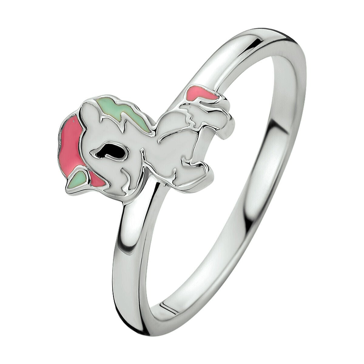 Zilveren gerhodineerde ring met springende pegasus gekleurd in pastel kleuren.