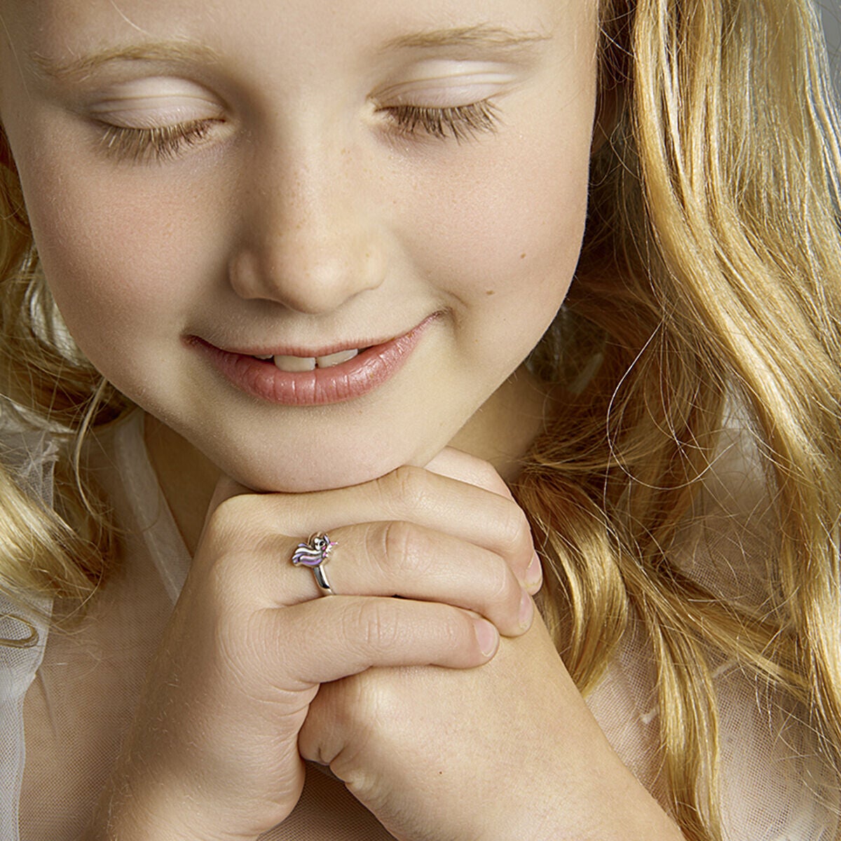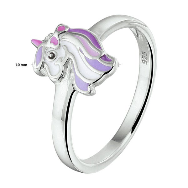 Zilveren gerhodineerde ring met schattige eenhoorn met paarse manen en roze accenten.