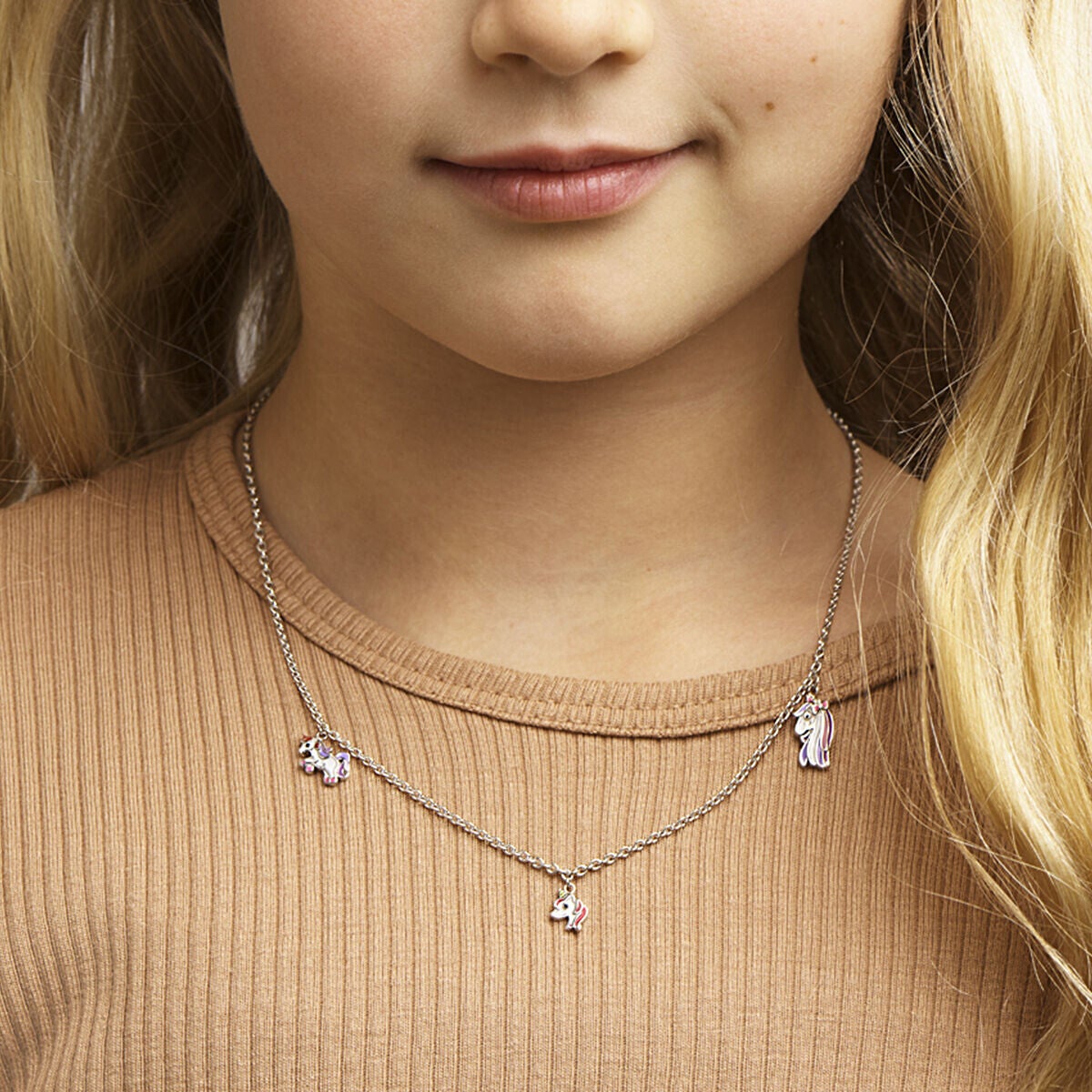 Zilveren gerhodineerde ketting met drie verschillende eenhoorn bedels gekleurd in wit met roze en paarse accenten. Dankzij de handige verlengketting kan deze ketting op verschillende lengtes gedragen worden.