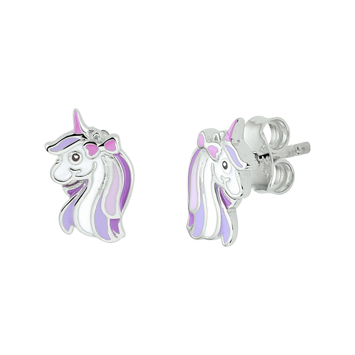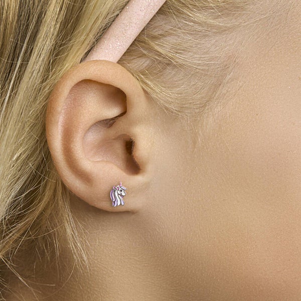 Zilveren gerhodineerde oorknoppen met schattige eenhoorns met paarse manen en roze accenten.