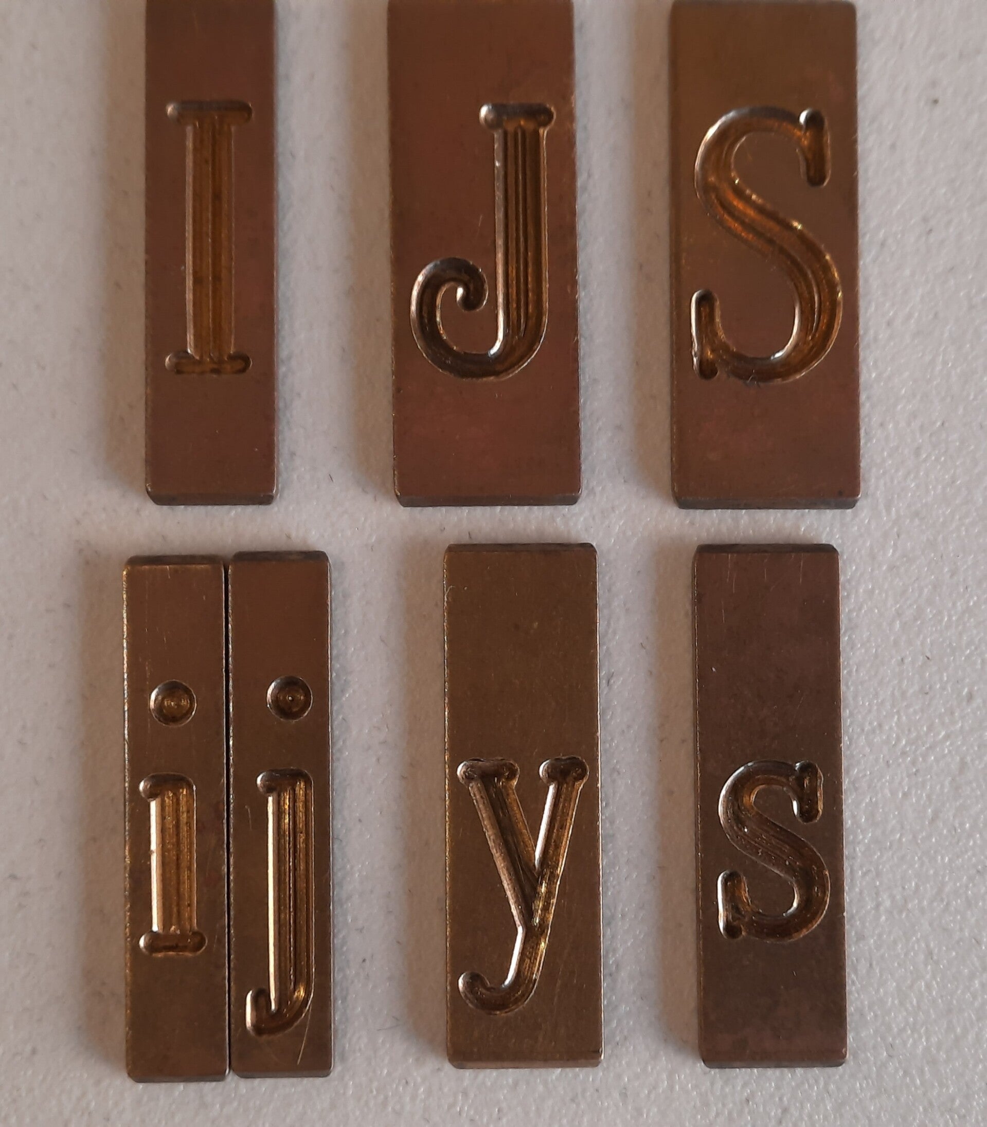 Op de foto met de SIERLETTERS zie je van links naar rechts van boven naar onder: Hoofletter I , Hoofdletter J en de Hoofdletter S met daaronder de kleine letter i en j, de kleine griekse y en de kleine letter s.