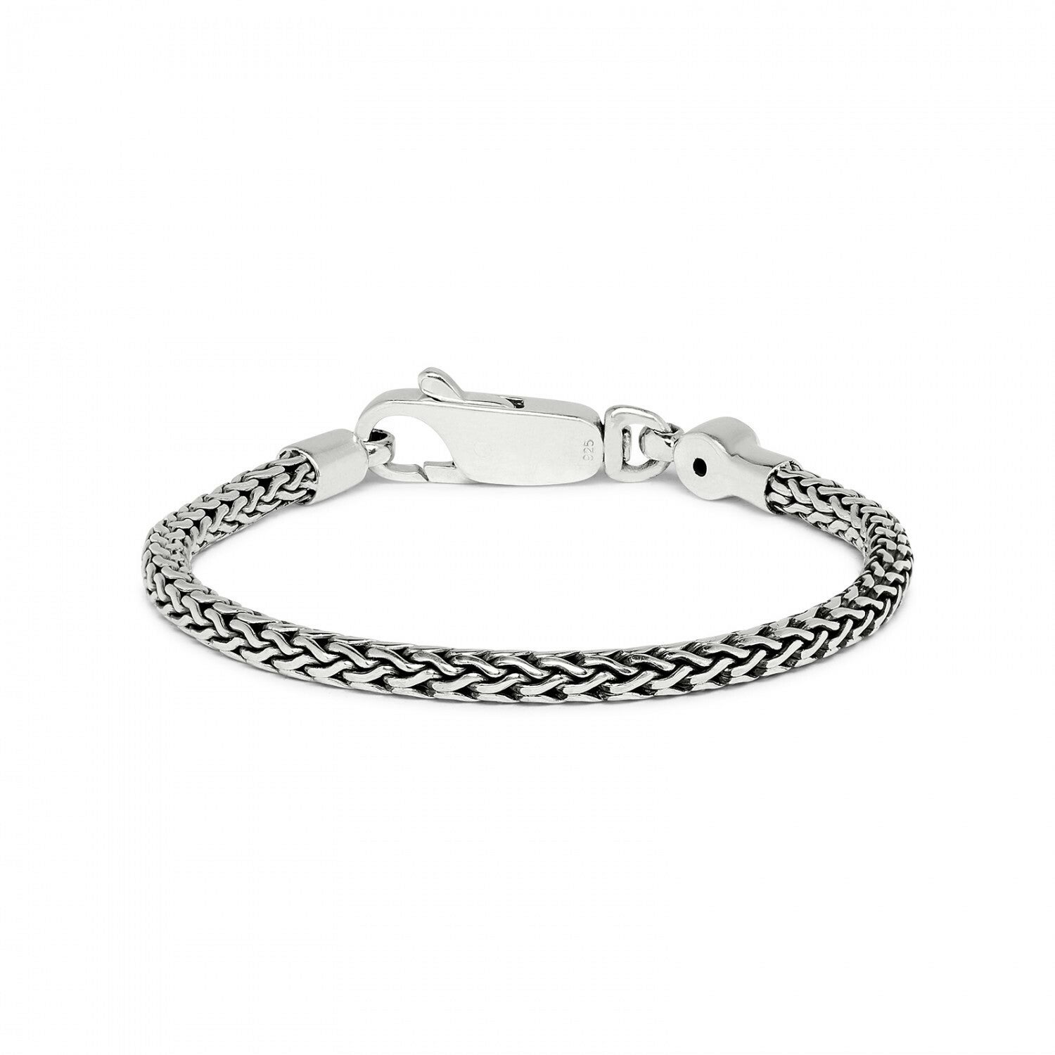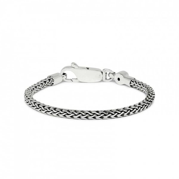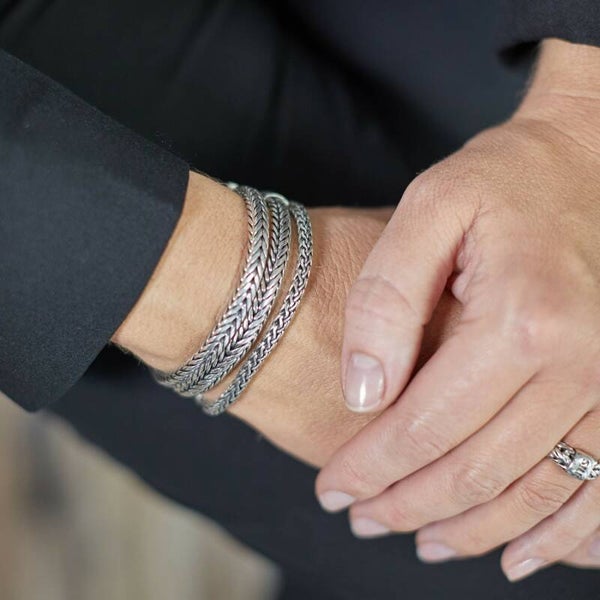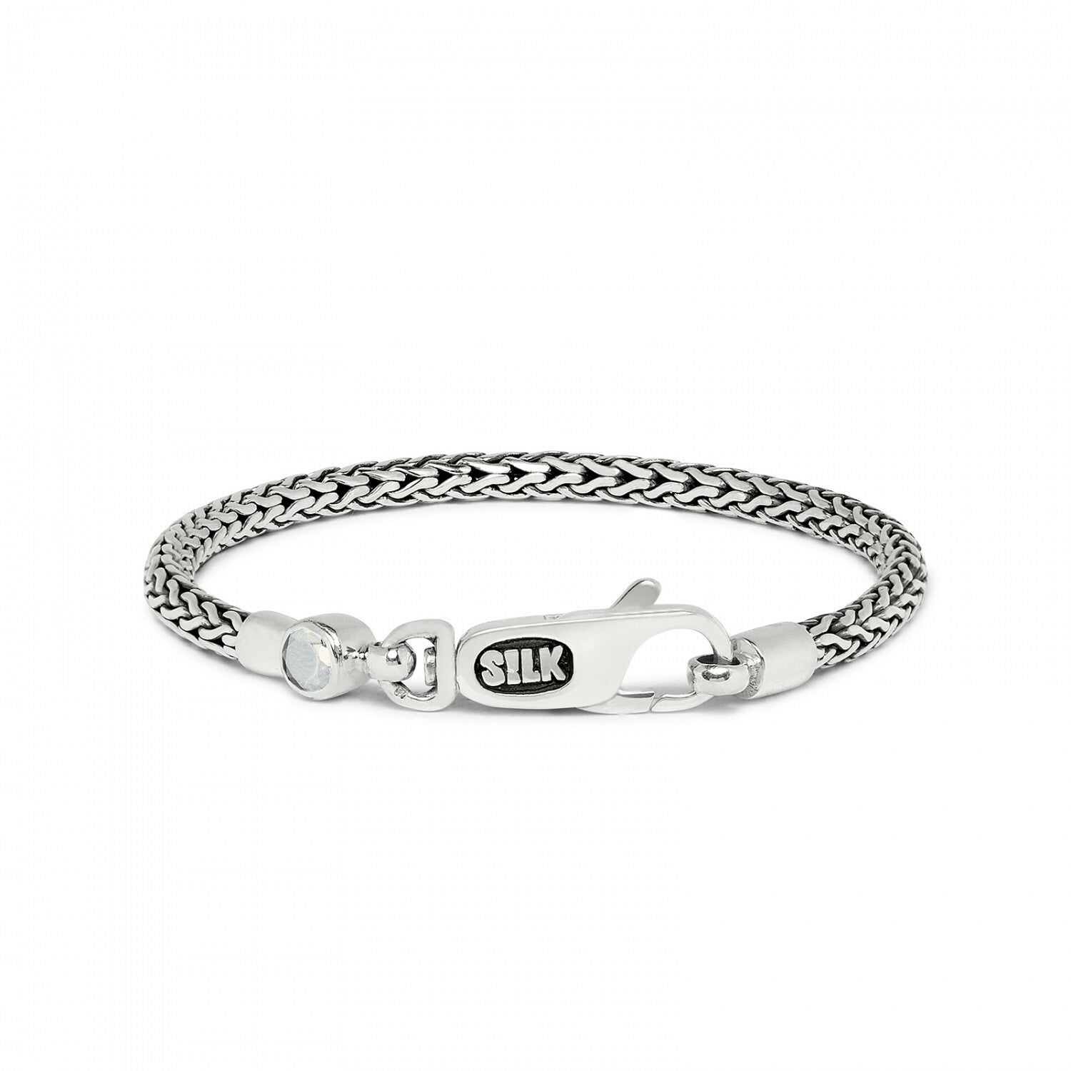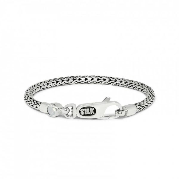 De zilveren Roots collection 330 armband van Silk Jewellery is een mooi rond armbandje met een fijn gevlochten Balinese structuur en een karabijn haak sluiting. Uniek aan deze armband is het witte granaat steentje. Combineer tot een eigenzinnige creatie met de andere smalle armbandjes uit de Roots collection serie. De armband wordt in een mooie luxe geschenkverpakking verpakt.