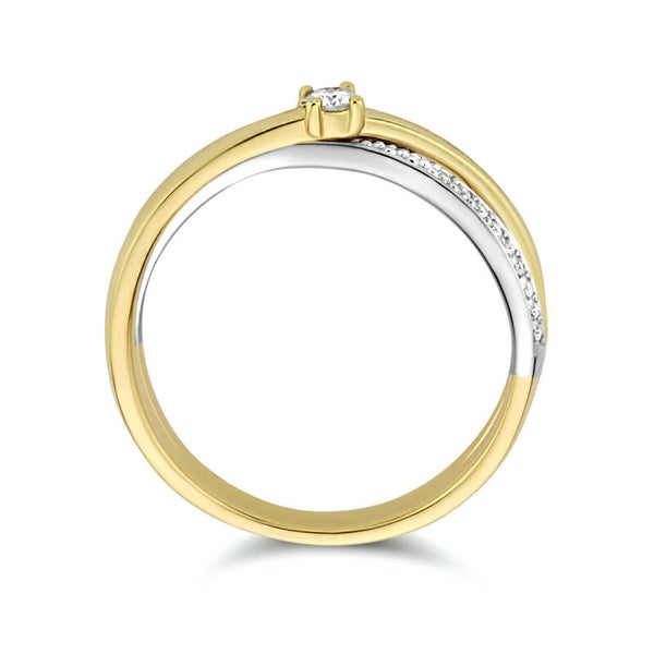 14k Bicolor geel- en witgouden ring uitgevoerd met schitterend diamant briljant geslepen, h, si. De ring heeft een breedte van 5mm.