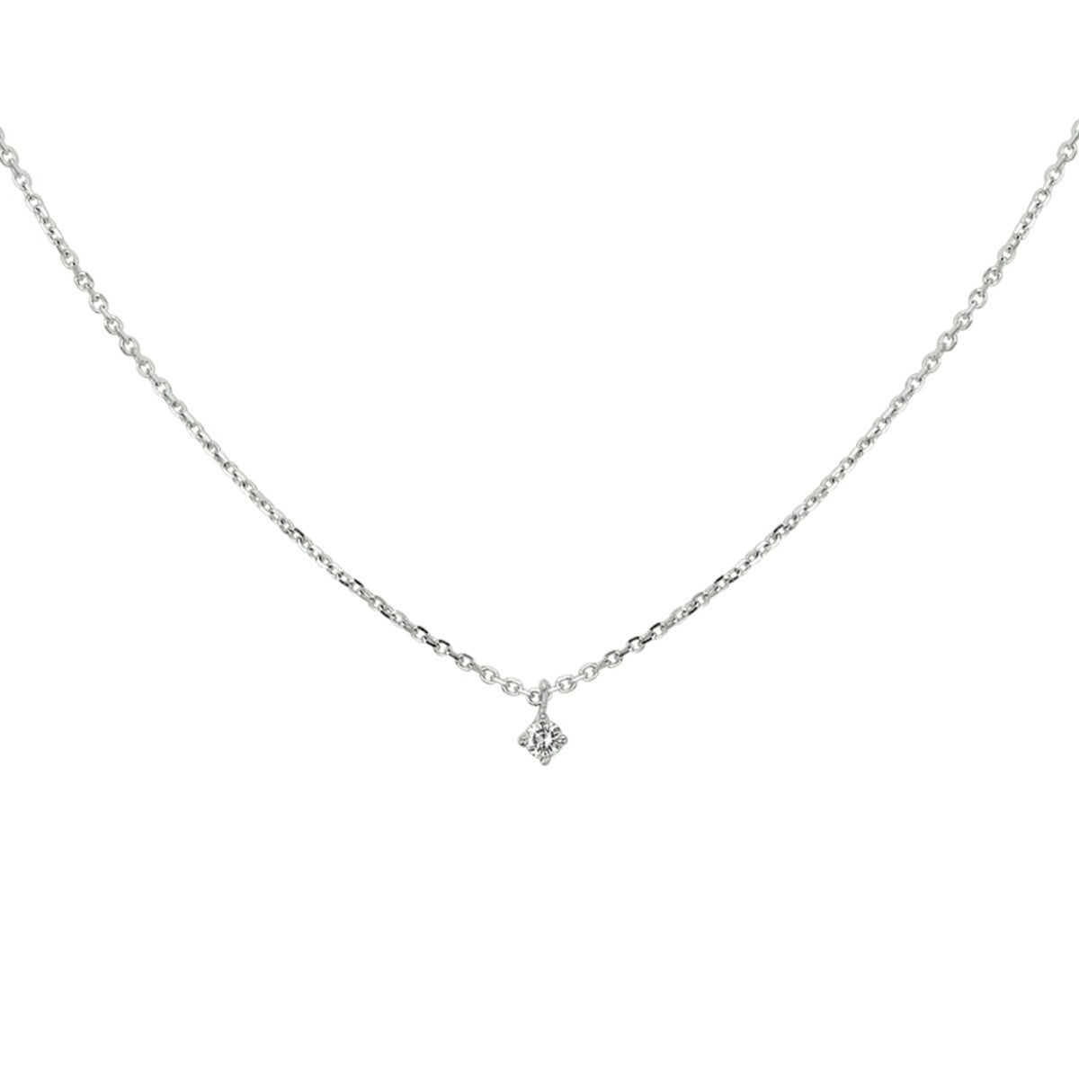 14k Witgouden collier met een diamant, h, si van 0.05ct en een karabijn sluiting. Met draaglengtes van 41, 43 en 45cm en de schakelbreedte is 1.25mm.