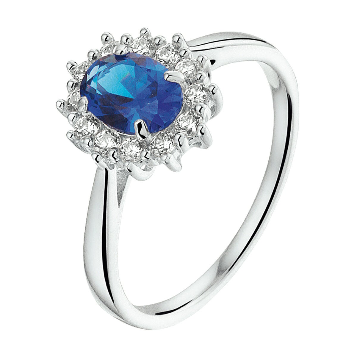 Gerhodineerde zilveren ring met synthetisch saffier voor de prachtige blauwe kleur en zirconia's voor dat beetje sprankel. In een mooi speels maar elegant ontwerp.
